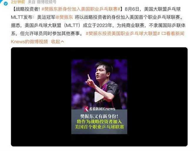 美国乒乓球大联盟官方账号日前发布公告,确认奥运冠军樊振东将参与联盟战略投资。该联盟成立于2021年,是美国首个职业乒乓球联赛,旨在提升乒乓球运动在北美地区的影响力。樊振东此次投资标志着中国乒乓球运动员首次以资本方身份参与国际职业联赛运营。