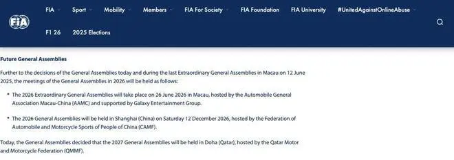 国际汽联(FIA)在2025年度大会上正式宣布,2026年FIA年度大会将由中国汽车摩托车运动联合会(CAMF)在上海主办。与此同时,2025年FIA国际汽联年终颁奖典礼于北京时间12月13日凌晨2点在乌兹别克斯坦塔什干举行,揭晓了多项世界级赛车赛事年度奖项归属。