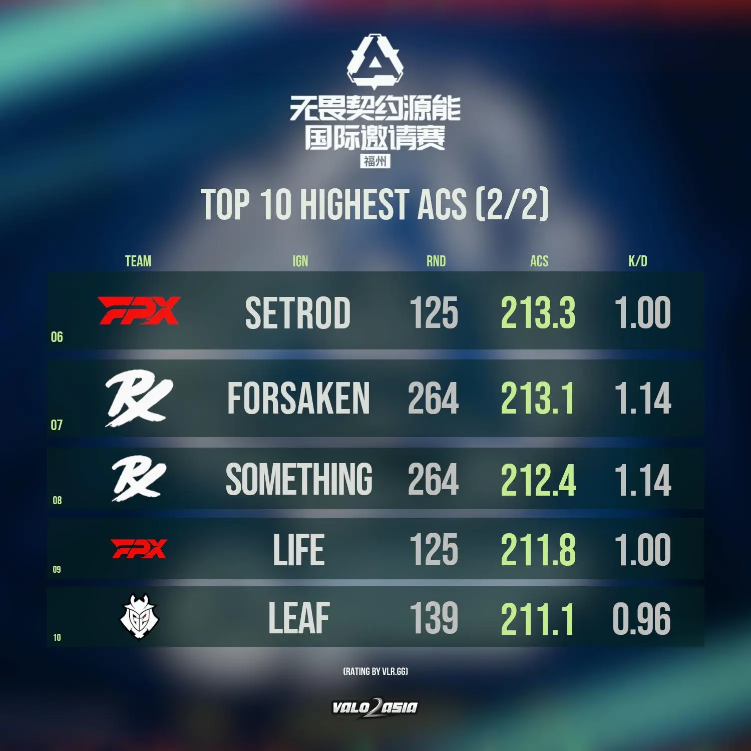 来自G2战队的jawgemo以统治级表现荣膺ACS排行榜首位,这位选手在关键局中的精准操作和战术意识令人印象深刻。值得注意的是,排名前十的选手中,PRX战队独占四席——Jinggg、d4v41、f0rsakeN和something分别位列第二、第四、第七和第八位,展现出这支队伍恐怖的整体实力。G2另一名选手leaf也跻身前十,与队友jawgemo形成双核驱动。