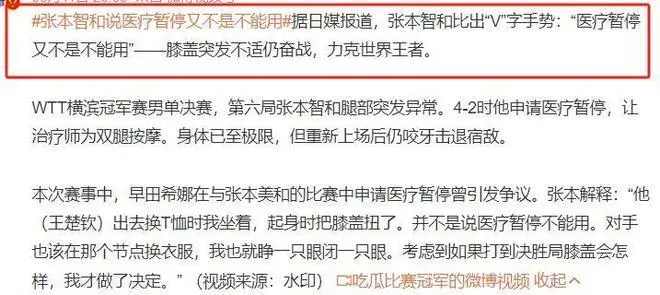 张本智和解释称,膝盖受伤发生在王楚钦离场更换球衣时。他同时指出,按规定运动员应在场内完成装备更换。日本选手强调医疗暂停是规则赋予的权利,并在接受日媒采访时展示了积极态度。