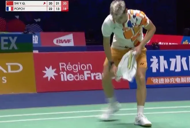比赛进入18平后,石宇奇连得2分取得20-18领先。在石宇奇获得赛点准备发球时,小波波夫突然要求边裁清理场地积水。现场视频显示,小波波夫不仅要求工作人员擦地,还自行用鞋和毛巾反复擦拭同一区域,这一行为持续约两分钟。