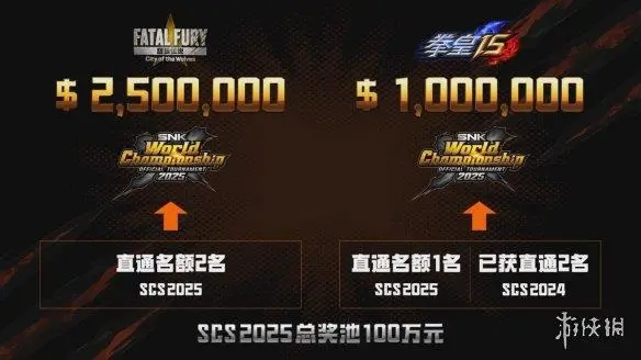 SCS 2025赛事设置《拳皇15》和《饿狼传说:群狼之城》两个比赛项目,总奖金池达100万元人民币。该赛事自2025年5月启动以来,已吸引全球多个国家和地区的职业选手参与。