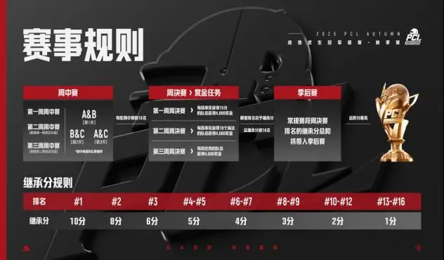 本次PCL秋季赛将通过动态分组、多阶段赛制等创新设计,全面检验各战队战术执行和临场应变能力。赛事结果将直接影响战队升降级,为后续国际赛事选拔参赛队伍奠定基础。