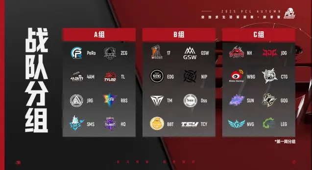 A组包括PeRo、4AM等8支战队,其中PeRo是2025春季赛冠军,4AM为传统强队。B组由17、EDG等队伍组成,17战队曾在PGS7赛事中夺冠。C组包含NH、CTG等战队,NH曾获PGC世界冠军,CTG在2024春季赛进入前三。