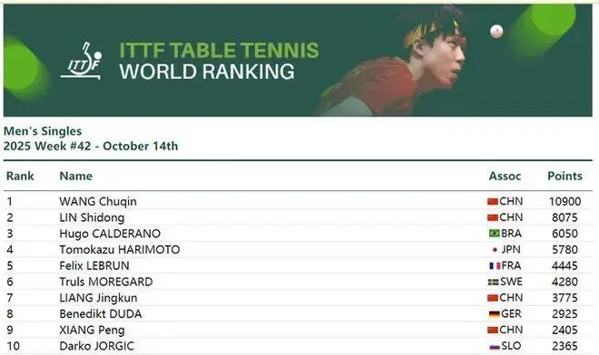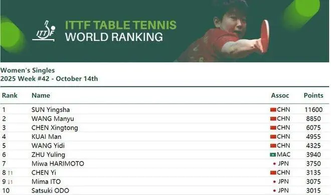 10月14日,国际乒联公布了最新一期世界排名。女单方面,孙颖莎以11600分连续第170周位居榜首,王曼昱以8850分排名第二,陈幸同以6075分位列第三。男单排名中,王楚钦以10900分保持第一,林诗栋以8075分排名第二,巴西选手雨果以6050分位居第三。