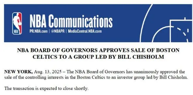 北京时间8月14日,NBA官方正式批准波士顿凯尔特人队控股权转让交易。由投资家奇泽姆领衔的财团将以61亿美元估值收购球队至少51%股份,剩余股权预计在2028年完成交割。
