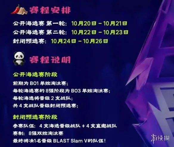 BLAST Slam V中国区预选赛正在激烈进行中,公开海选赛第一阶段已进入尾声,10支参赛队伍正在争夺4个封闭预选赛晋级名额。第二阶段比赛将于10月22日至23日举行,最终胜出的4支队伍将与4支直邀战队共同参加10月24日至26日的封闭预选赛,角逐代表中国区参加11月25日成都正赛的资格。
