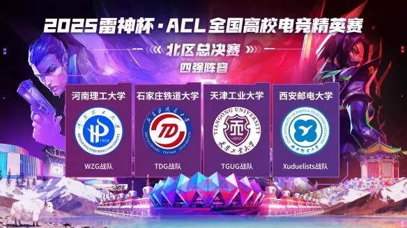 2025年雷神杯·ACL全国高校电竞精英赛北区总决赛将于11月22日至23日在青海省西宁市青海大剧院举行。经过北方赛区100余所高校、800多支队伍的选拔,西安邮电大学Xuduelists战队、石家庄铁道大学TDG战队、河南理工大学WZG战队和天津工业大学TGUG战队四支队伍晋级决赛。