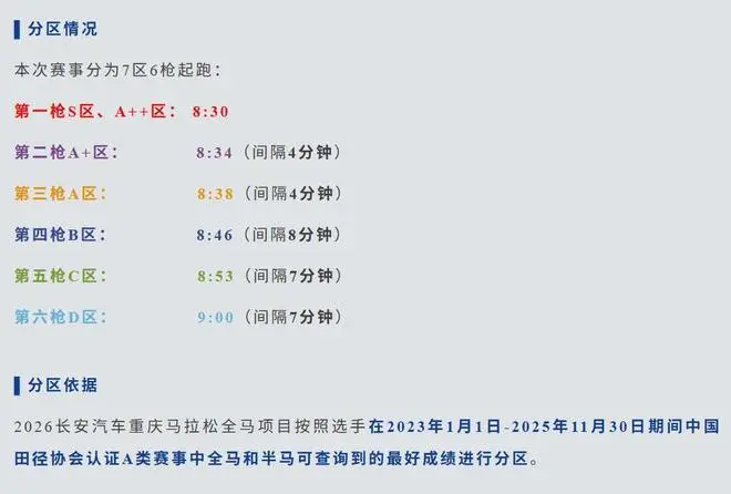 本届赛事最引人注目的创新是采用7个分区、6枪出发的起跑方式。起跑时间从8:30到9:00依次进行,其中S区和A++区以红色标注,其他分区采用不同颜色区分。这种精细化的分区设计旨在提升赛事运行效率,减少选手间的相互干扰。
