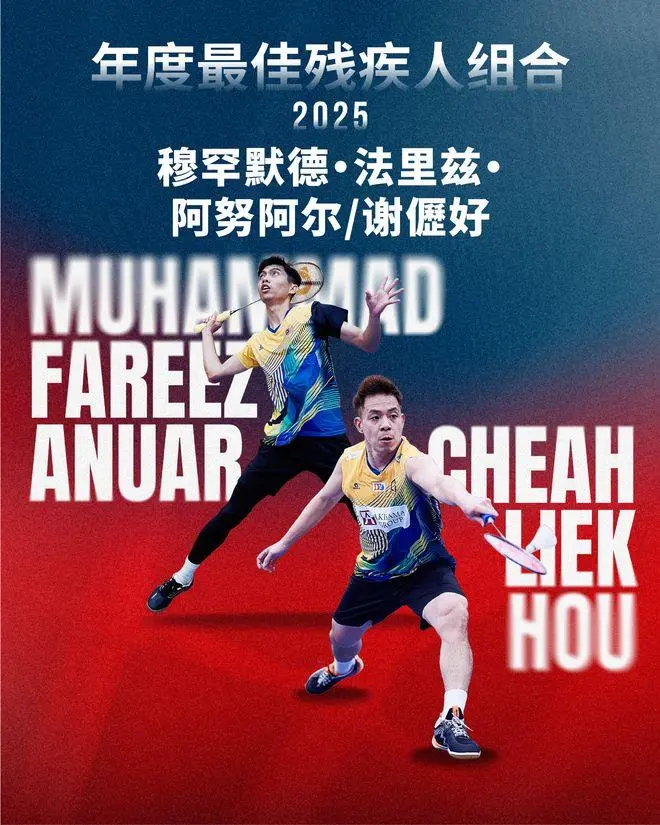 残疾人组别方面,中国选手谢儮好在SU5级别同时包揽年度最佳男运动员和最佳组合(搭档穆罕默德·法里兹·阿努阿尔)两项殊荣。意大利运动员伊拉丽亚·奥尔贾蒂则获得WH2级别年度最佳女运动员称号,延续了欧洲选手在该级别的优势地位。