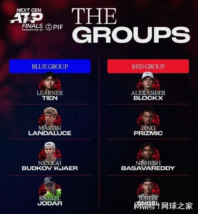 ATP新生力量总决赛分组抽签结果于同日公布。蓝组包括头号种子钱、4号种子兰达鲁斯等选手,红组由2号种子布洛克斯领衔。赛事将于12月17-21日在沙特吉达举行,采用小组循环加淘汰赛制。