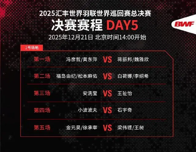2025年世界羽联年终总决赛于12月21日进入第五比赛日,五个单项决赛全面展开。中国队表现强势,在混双、女单、男单、男双四个项目中晋级决赛,向年度总冠军发起冲击。