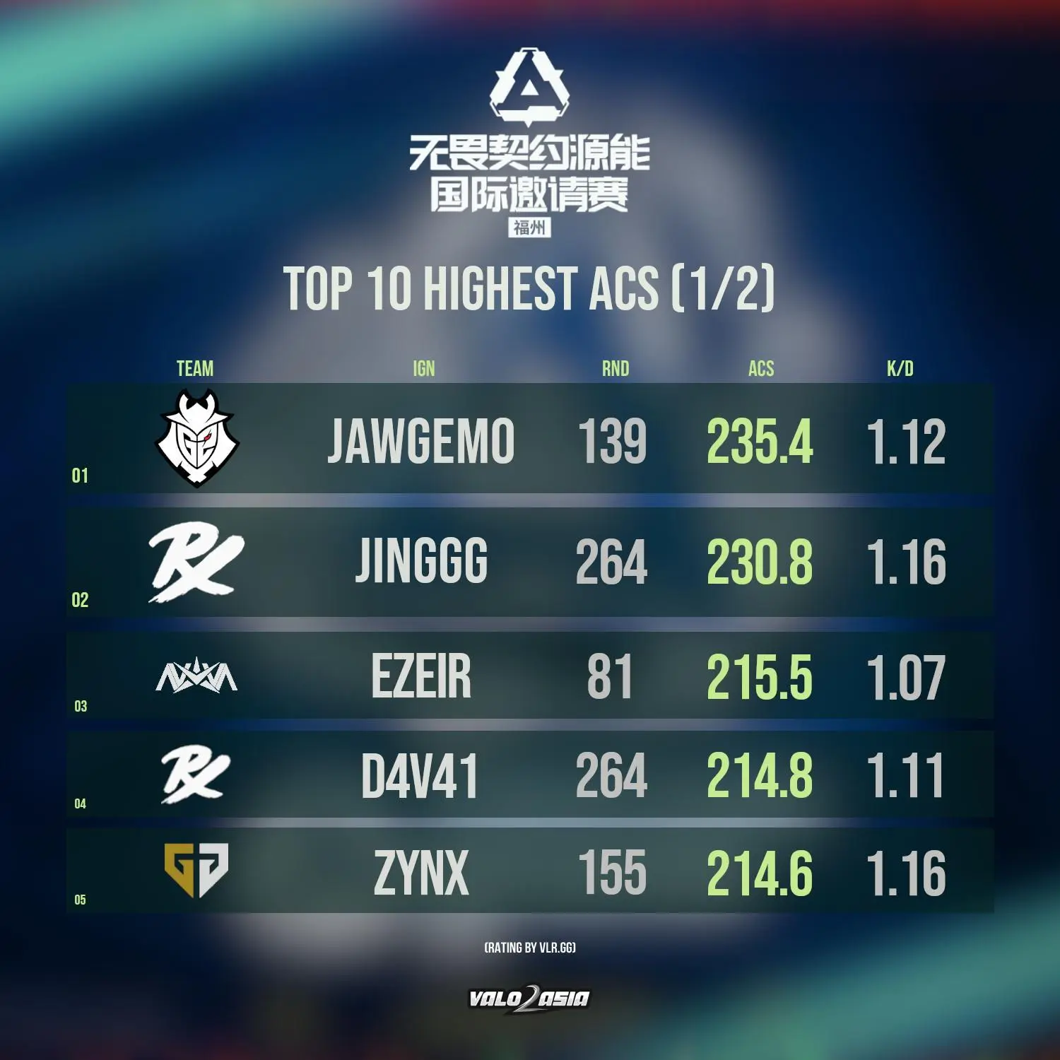 来自G2战队的jawgemo以统治级表现荣膺ACS排行榜首位,这位选手在关键局中的精准操作和战术意识令人印象深刻。值得注意的是,排名前十的选手中,PRX战队独占四席——Jinggg、d4v41、f0rsakeN和something分别位列第二、第四、第七和第八位,展现出这支队伍恐怖的整体实力。G2另一名选手leaf也跻身前十,与队友jawgemo形成双核驱动。